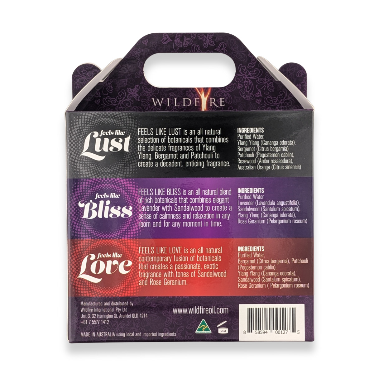 The Wildfire Mood Mist Gift Pack invites you to explore love, calm, and passion in your own space. Each aromatic mist is a unique addition to your environment, enhancing moments of connection, relaxation, and allure. Elevate your senses, transform your space, and enjoy the journey through Feels Like Love, Feels Like Bliss, and Feels Like Lust. Let Wildfire be the finishing touch in creating a personal sanctuary that speaks to your heart.